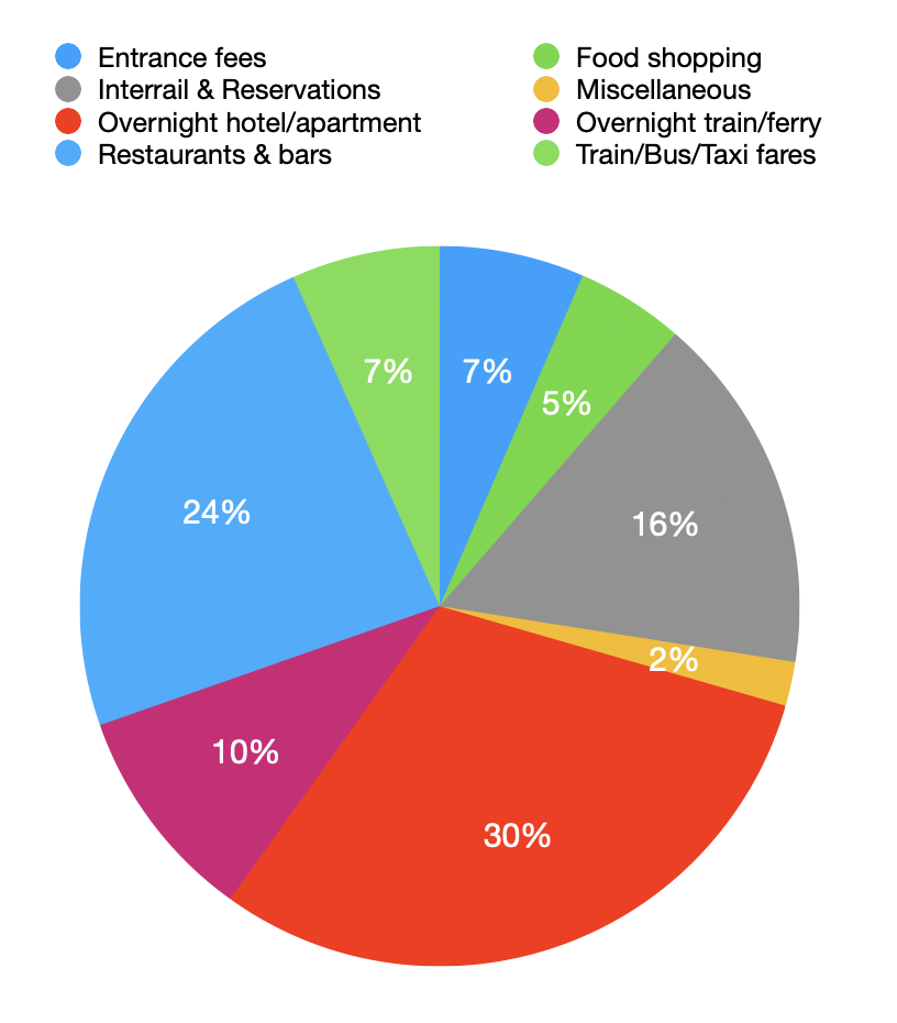 Clearly, one of the biggest differences is cost of train travel vs. diesel, motorway tolls etc. and overnight accommodation in hotels & apartments instead of a few euros on a camping ground. We also spent more eating out with fewer options for self-catering.